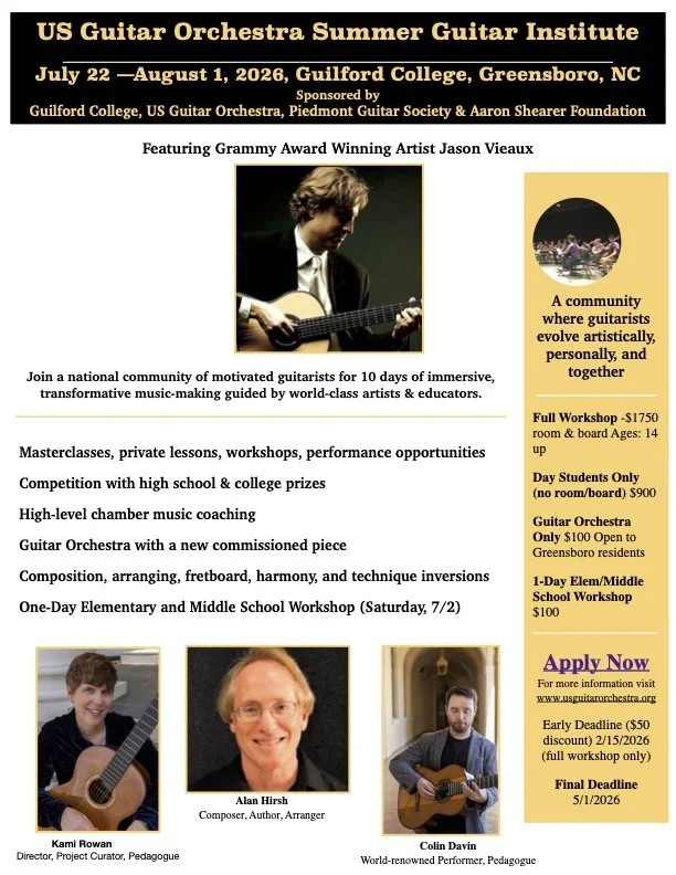 The USGO Summer Institute is inspired by the Eastern Music Festival. Kami Rowan, Jason Vieaux, and Alan Hirsh are here to continue to offer an educational and community-driven workshop welcoming guest artist Colin Davin on Guilford College’s beautiful campus July 22-August 1, 2026.